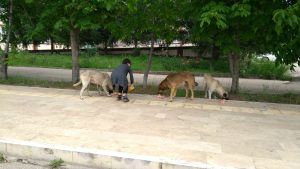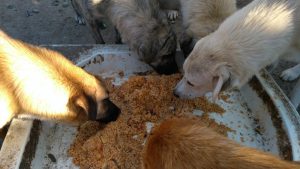 Zaman zaman yakındaki bir köyden köpekler de kampüse gelip bu beslemeden faydalanıyor.