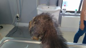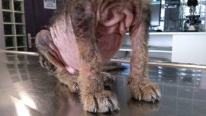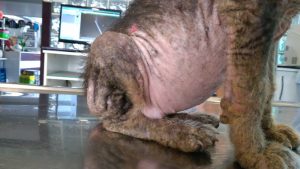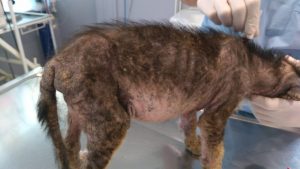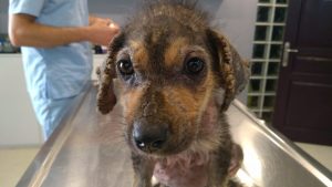 İhbar üzerine durumunu kontrol etmeye gittiğimiz yavru köpeğimiz ileri derece uyuz hastalığı nedeniyle kliniğe alınmıştır. Gerekli tedavisi yapıldıktan sonra ilgili aileye teslim edilecektir. Aile maddi olarak tedaviyi karşılayamadığı ve hastalığını da tespit edemediği için tarafımıza ulaşmıştır.