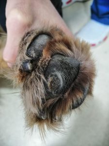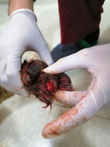 Besleme bölgemizin adeta maskotu haline gelen “Ayı”mız maalesef yeniden klinikte. Son besleme günümüzde yine yanımıza koşarak gelip pati veren Ayı’nın tüylerinde kan görünce panikledik. Sağ ön patisinin de kan içinde olduğunu görünce hemen arabaya aldık. Klinikteki incelemede pati yaralanmalarında en zor vakalardan biriyle karşı karşıya olduğumuz görüldü. Ayı’nın patisi kesilmişti hem de iyileşmesi en zor yerden. Cam kırığı ya da jiletle olmuş olabileceğini düşündüğümüz kesiğin tedavisine başlandı.