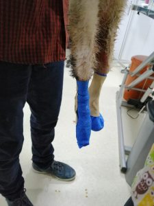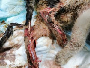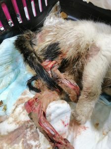 Arka iki bacağının ve kuyruğunun derisi yüzüldüğü için tedaviye alınan kedimizin bacaklarında, kalçasında ve kuyruğunda da kırıkları var. Tedavisine başlanan kedimizin kuyruğu maalesef kırık nedeniyle kesilecek. Yüzülen derinin tedavisi için şu an her gün pansuman tedavisi sürdürülüyor.