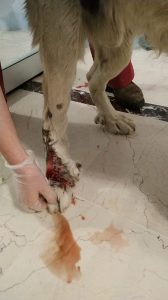 Kızılcahamam’da patisi kanlar içinde bulunan köpeğimizi Ankara’ya getirttik. Klinikte genel kontrolünün ardından patisinin tedavisine başlanmıştır.