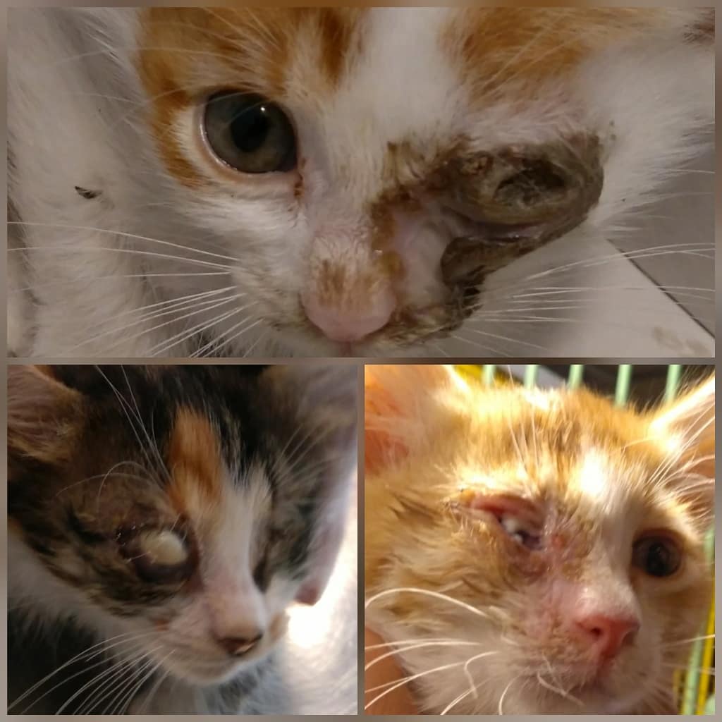 Her birinin tek gözünde problem olan kedilerimizin bu problemlerinin yaşadıkları bölgedeki kötü koşullar nedeniyle bu sorunu yaşadıkları düşünülüyor. Maalesef her biri tek gözünü kaybetmişler. Kedilerimizden biri kliniğe getirildiği günün ertesinde hayata gözlerini yumdu. Diğerlerinin tedavileri devam ediyor. Güncelleme: Tedavisi biten iki kedimiz de sahiplendirildi.